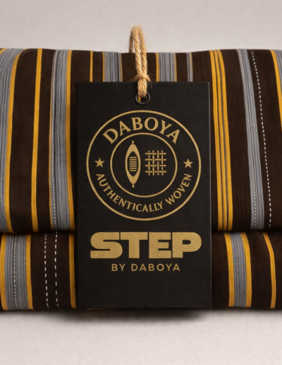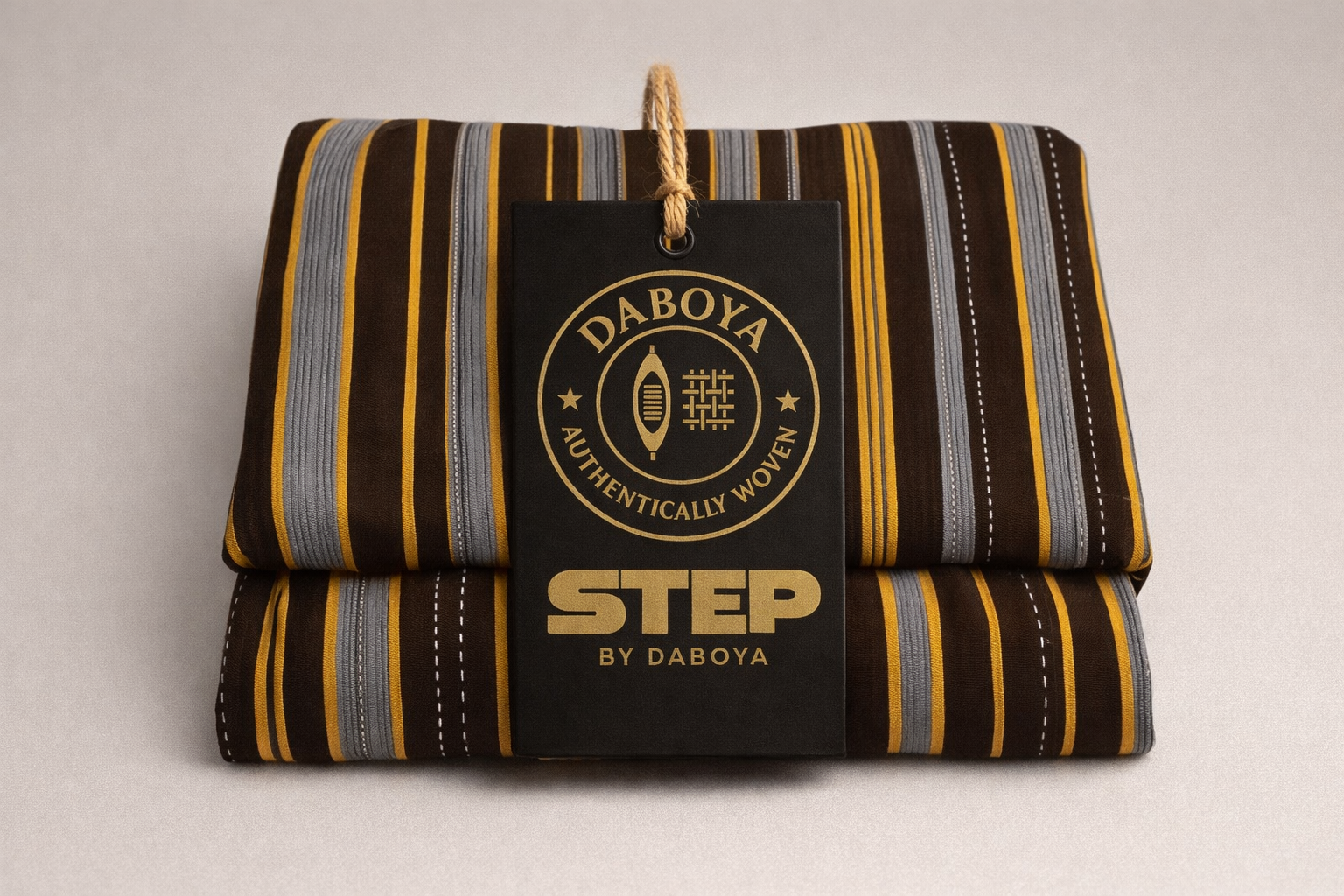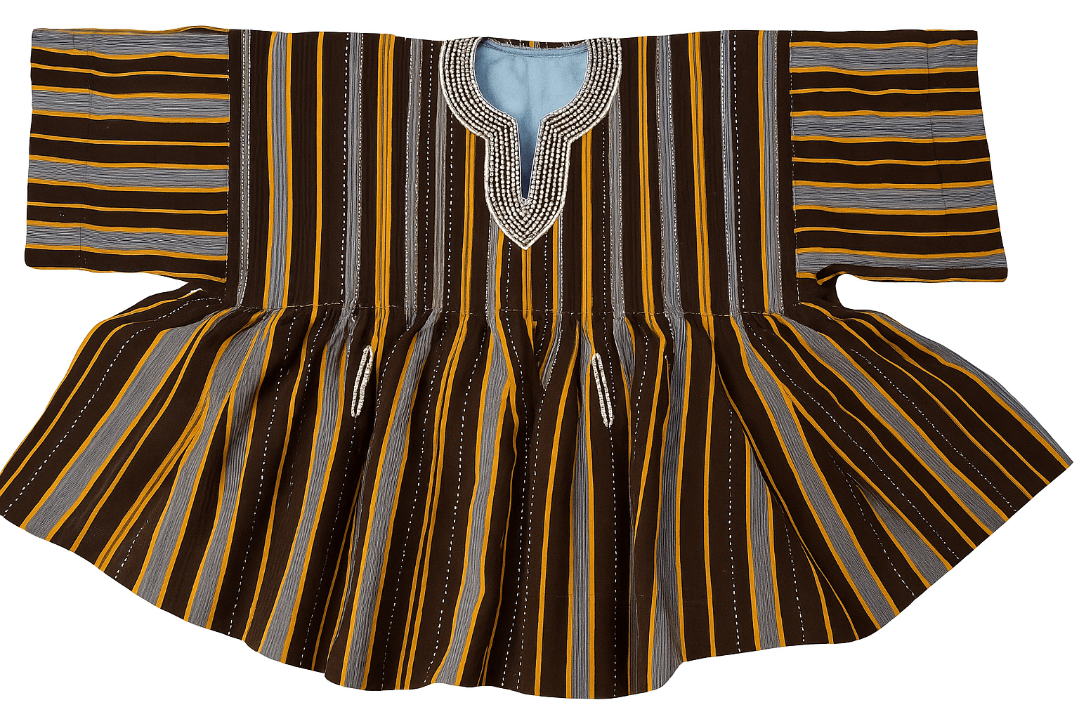 Earthy brown, grey, and gold tones representing warm highland landscapes. Detailed dotted neckline and traditional texture.