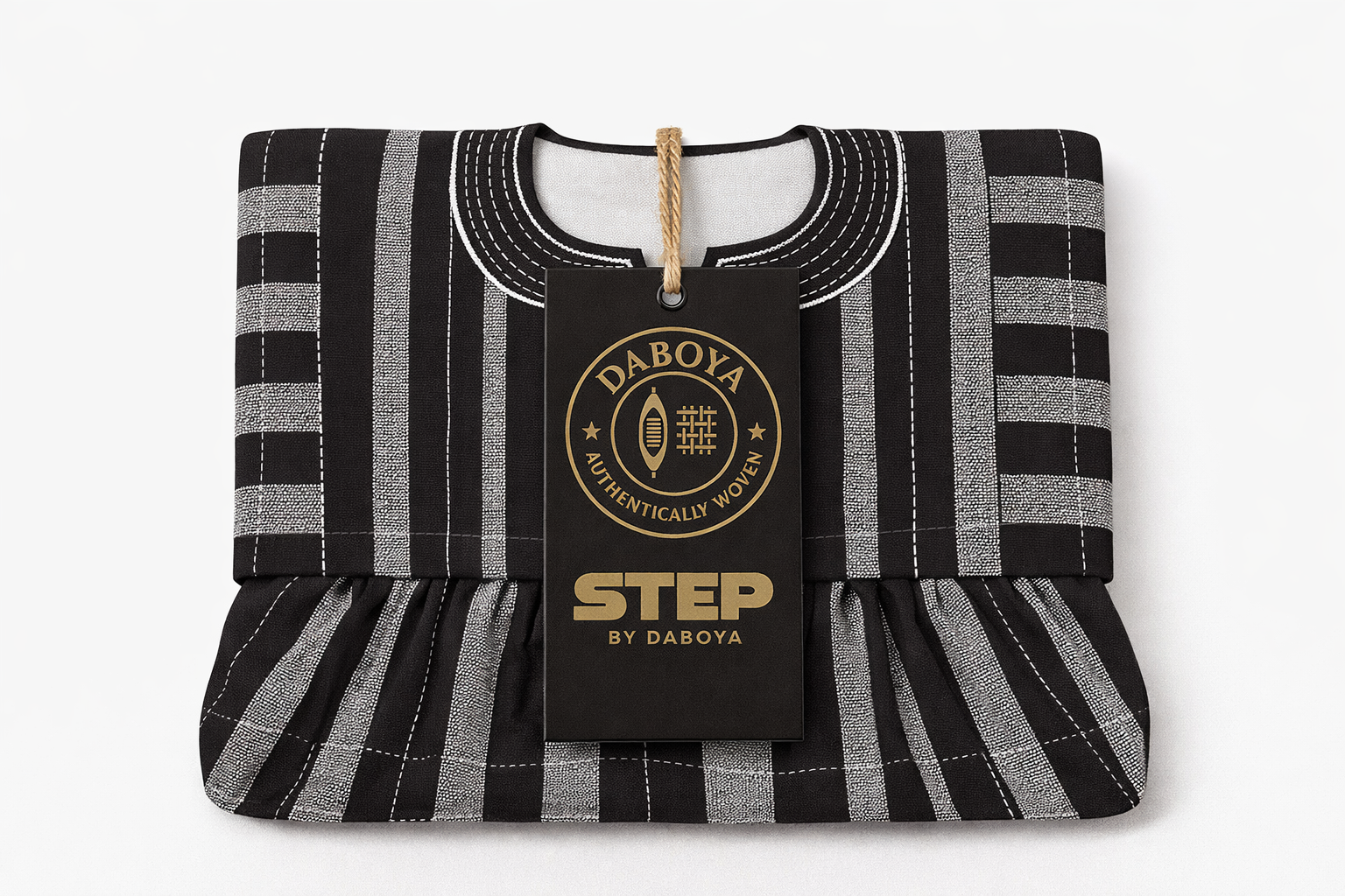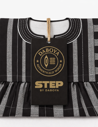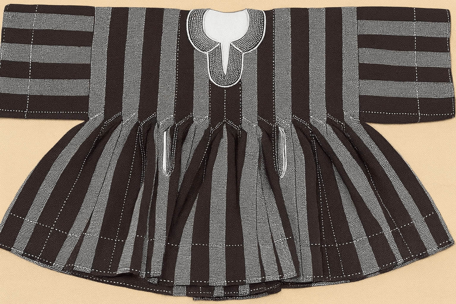 A refined handwoven smock in deep charcoal and silver-grey stripes. Features clean dotted stitching and a white neck design—classic, calm, and elegant.