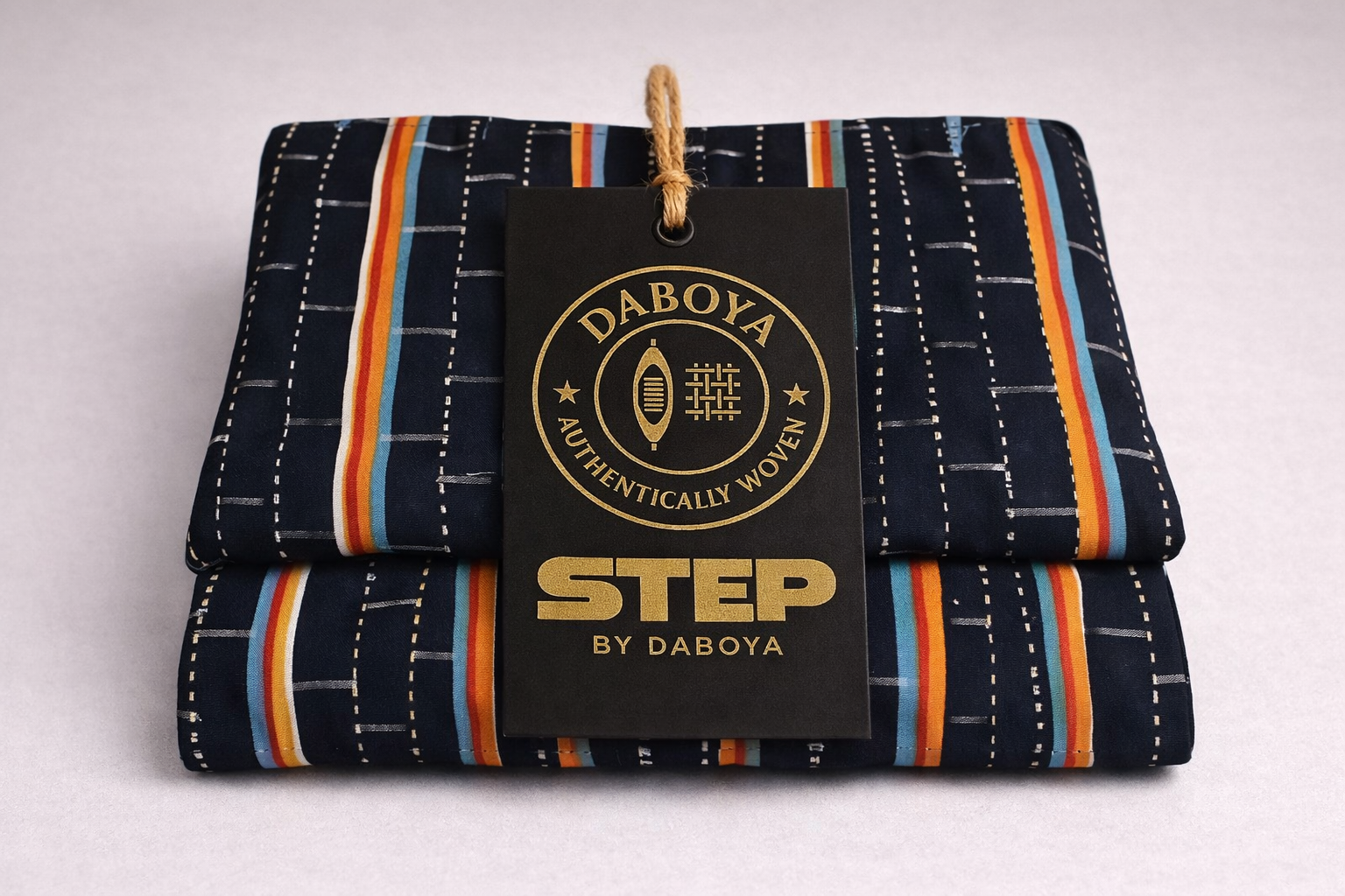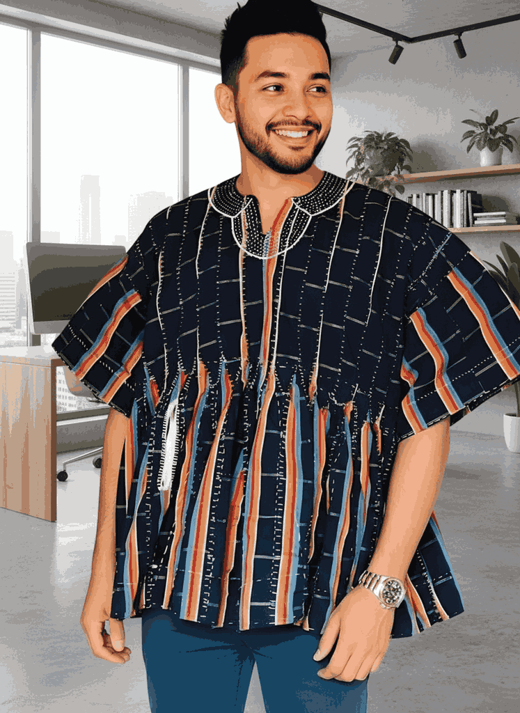 A vibrant blend of navy with sunset hues of orange, red, teal, and white. Lightweight, expressive, and ideal for cultural celebrations or casual styling.