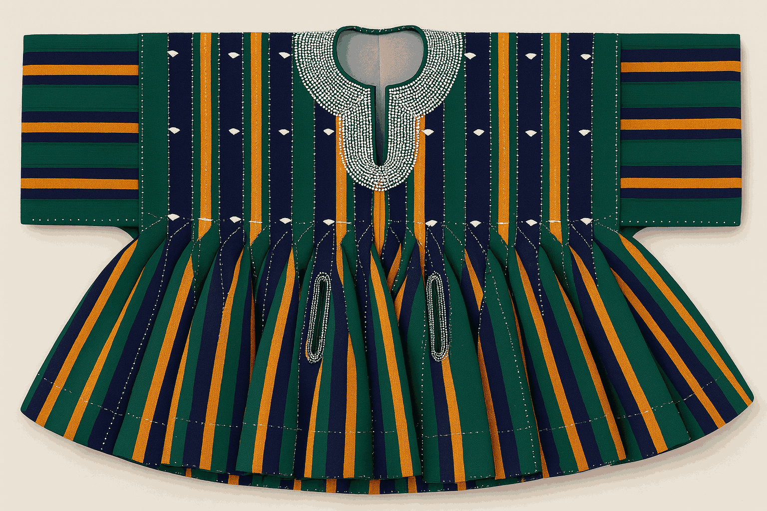 A vibrant blend of navy with sunset hues of orange, teal, and white. Lightweight, expressive, and ideal for cultural celebrations or casual styling.