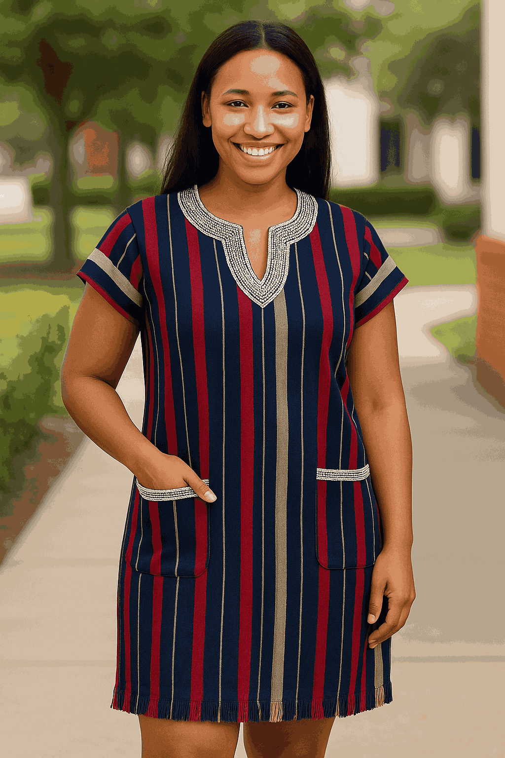 A classic shift-style smock dress with burgundy, navy, and taupe stripes. The neckline showcases clean Daboya embroidery, and twin pockets add balance to its refined, modern-traditional look.